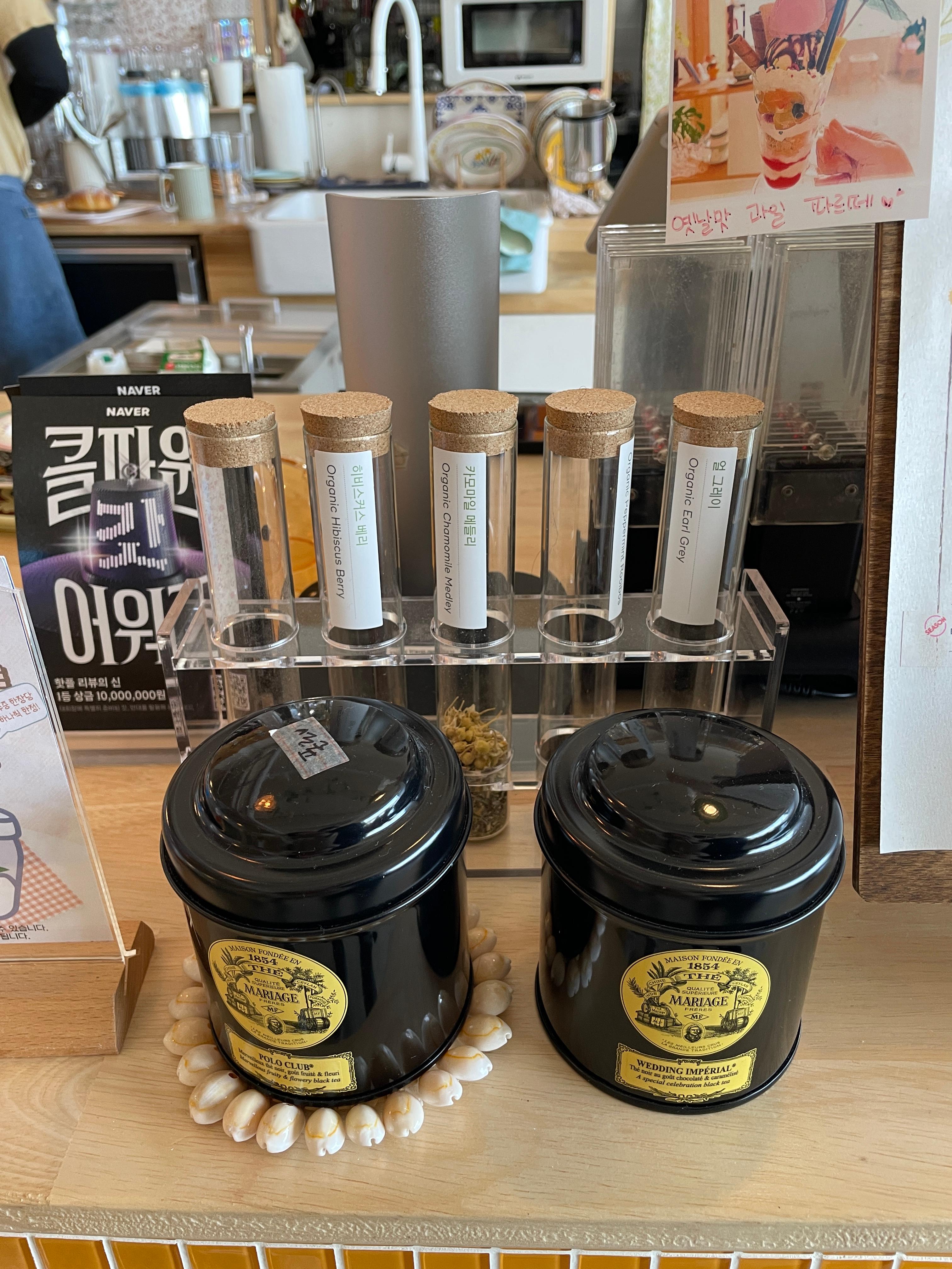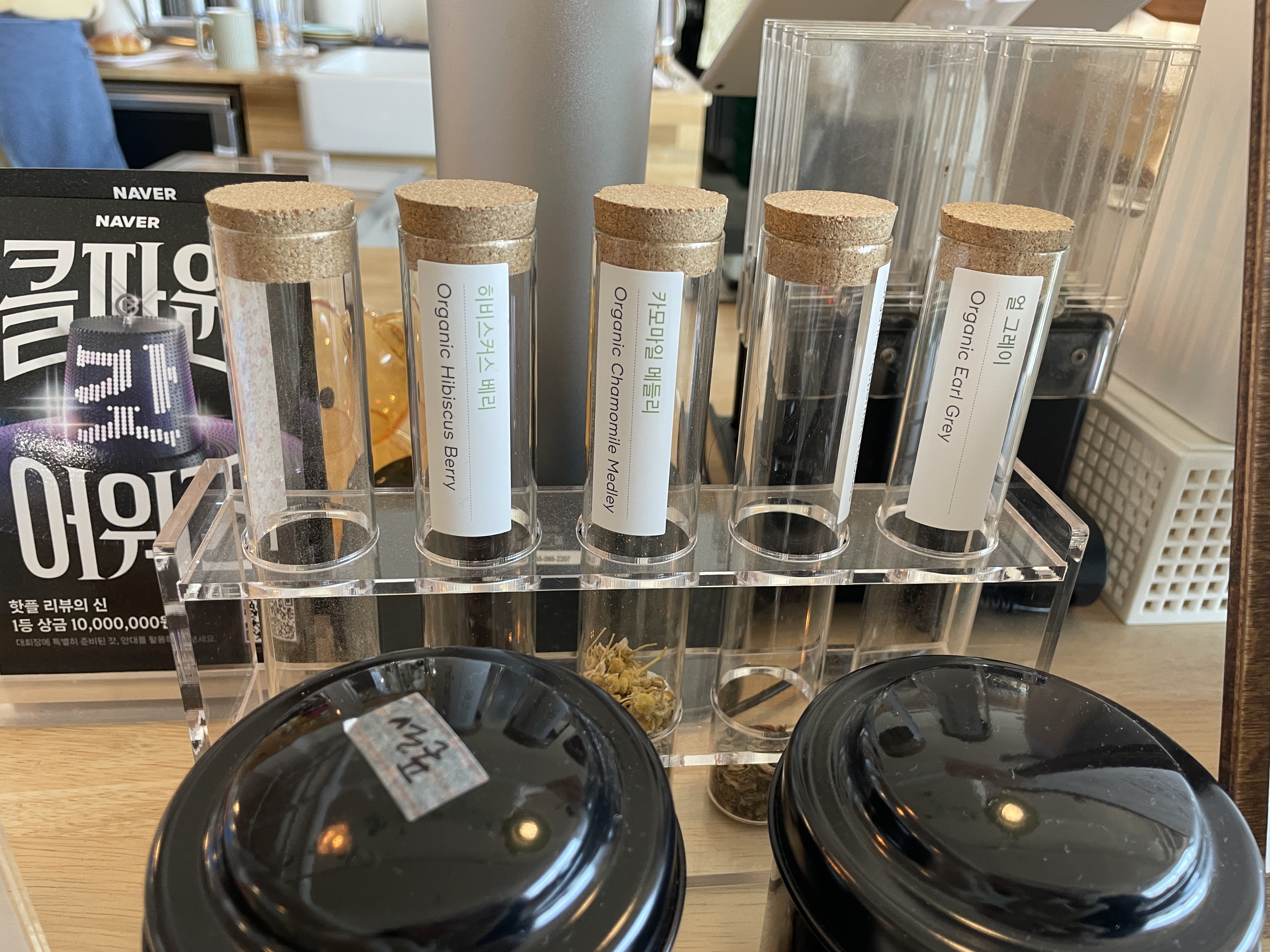 유기농 잎차는 향을 직접 맡아보고 고를 수 있도록 카운터에 소분을 해 놓으셨어요. 어떤 차를 마실지 고민이 된다면 직접 향을 맡아보고 선택할 수 있어 좋은 것 같아요.