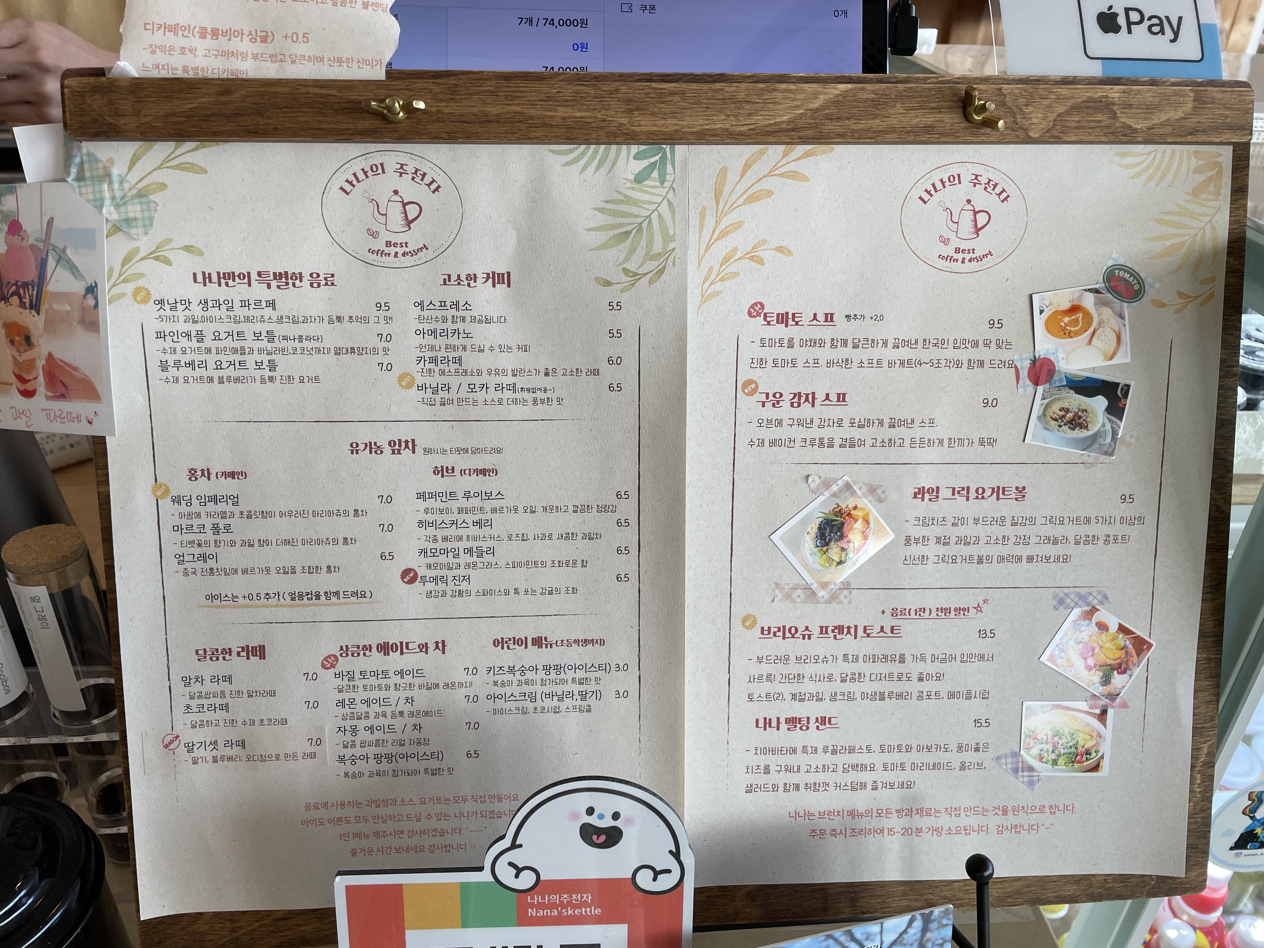 나나의 주전자에는 다양한 메뉴가 많았는데요, 커피를 비롯한 다양한 음료 및 브런치 메뉴도 있어 원하는 메뉴를 골라 먹으면 됩니다. 커피는 디카페인 원두로 변경이 가능하고, 사용하는 원두에 대한 설명도 적혀있었어요. 어린이 메뉴도 준비되어 있으니 아이와 함께 방문해도 메뉴 고민 없이 음료를 고를 수 있습니다.